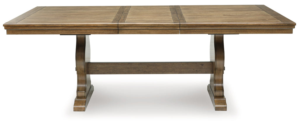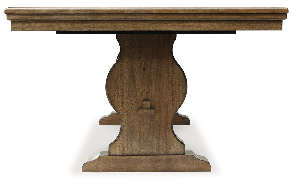 Traditional style doesn’t have to be stuffy. It can feel warm, inviting and beautifully in the moment. Case in point: this extension dining table. Showcasing a double-pedestal trestle base and a removable leaf, it has an allure all its own. Equally special is the rich brown finish, which exudes a mood of timeless charm. How's that for relaxed refinement?