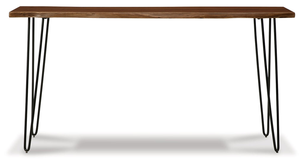 This stunningly simple solid mango wood dining table works effortlessly with contemporary decor. This narrow counter height table is perfect for smaller dining spaces. Or for added function, place it behind a sofa or sectional to make the most of your family room. The tabletop's gorgeous, natural-looking color contrasts nicely with the matte black metal legs, providing an instant upgrade to your space.