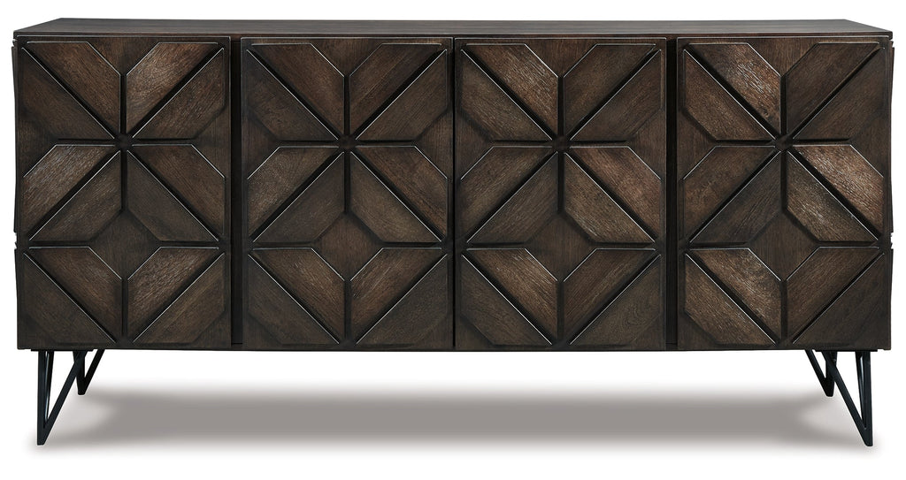 Entertain the possibilities with this extra large TV stand. Proving that furniture can be an art form, this sleek, chic cabinet stand—which accommodates up to 75" TVs—stands out from the crowd with a geometric overlay design that incorporates so much dimension. Adjustable shelving and cutouts for wire management make it highly accommodating. What's more, this TV stand works equally well as a dining room server or entryway console. How's that for staying power?