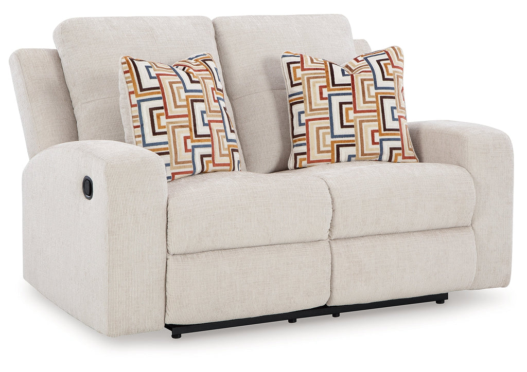 This reclining loveseat invites you to a luxuriously soft lounging experience. The chic hue fits right in with contemporary color palettes. A tufted back keeps the look right on trend. Balancing style and function, its pull tab reclining effortlessly takes you to relaxation mode.