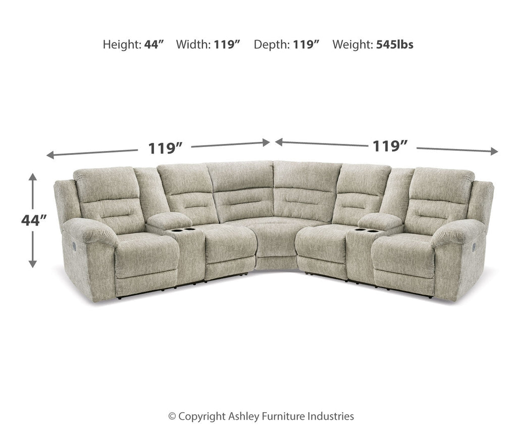 - Includes 3 pieces: left-arm facing power reclining loveseat with console, right-arm facing power reclining loveseat and wedge