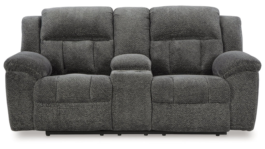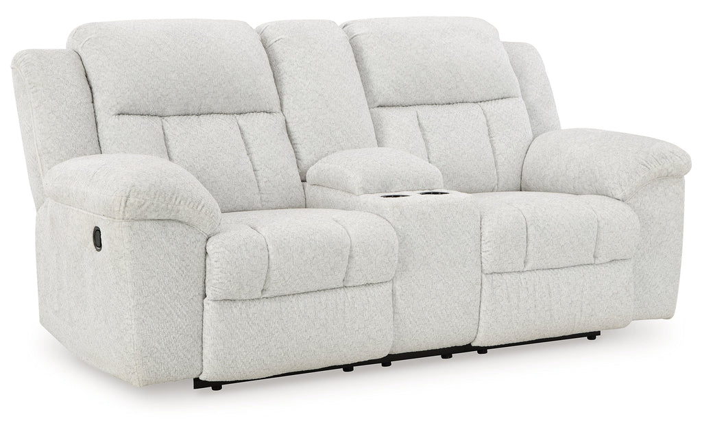 With its large-scale design, this extra-spacious reclining loveseat with console is a masterclass in accessible style. Plush, ultra-soft upholstery keeps everyone cozy as you lounge with family or guests. In a neutral hue, it seamlessly suits different aesthetics as your taste changes. Time to relax? The loveseat's pull tab reclining allows you to mellow out with ease.