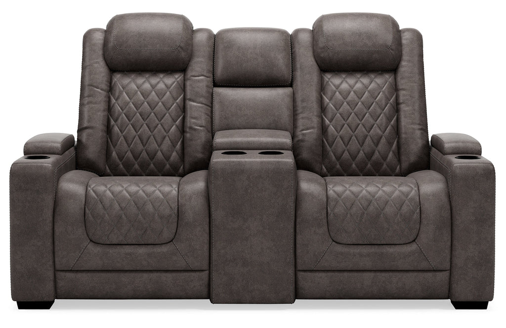 This power reclining loveseat in trendy gray is proof of just how far recliners have come when it comes to form and function. Ultra cool and contemporary, this fully loaded power reclining loveseat makes it so easy to social distance and make home your haven. Dressed to impress with diamond stitching inspired by sports car interiors, this reclining loveseat is covered in a fabulous faux leather with pebbled effect for authenticity. High-tech advancements include a one-touch power control with Easy View™ adjustable headrest and USB plug-in. Hidden storage compartments in the armrests and console are a welcome touch.