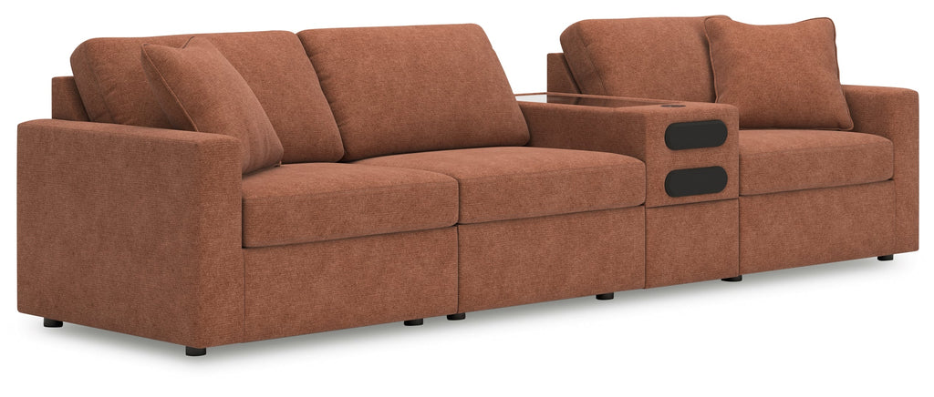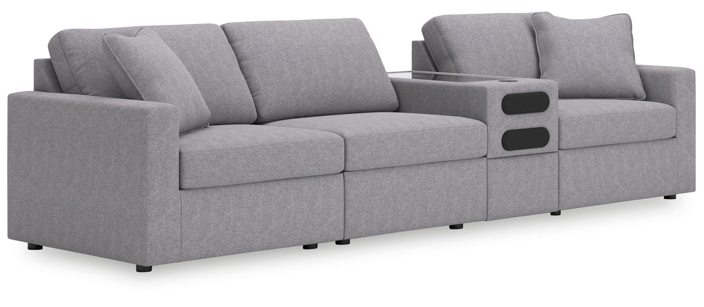 Includes 4 modular pieces: left-arm facing corner chair, armless chair, audio console with storage and right-arm facing corner chair"Left-arm" and "right-arm" describe the position of the arm when you face the pieceModular pieces can float anywhere; sides are finished (with no connectors)Corner-blocked frame; loose reversible seat and back cushions; high-quality foam cushions wrapped in poly fiberThrow pillows included; soft polyfillPolyester upholsteryNext-Gen Nuvella™ is a family-friendly fabric that is soft, easy to clean, stain-resistant and durable; easy-to-remove zippered covers for machine washingClean fabric with mild soap and water, let air dry; for stubborn stains, use a solution of 4 oz. bleach to 28 oz. waterNon-skid legsConsole with removable plexiglass top; pull-out drawer for storage; built-in audio sound system with wireless connectivity; audio controls located on console; USB chargingPower cord included; UL ListedPlatform foundation system resists sagging 3x better than spring system after 20,000 testing cycles by providing more even supportSmooth platform foundation maintains tight, wrinkle-free look without dips or sags that can occur over time with sinuous spring foundations.