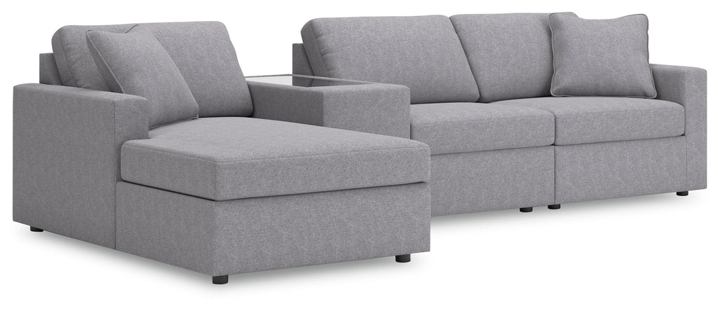 - Includes 4 modular pieces: left-arm facing corner chaise, armless chair, console with storage and right-arm facing corner chair