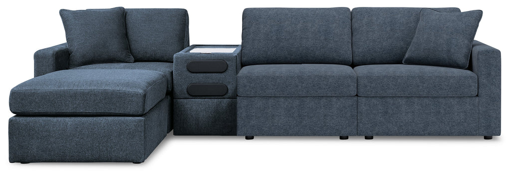 - Includes 4 modular pieces: left-arm facing corner chair, armless chair, audio console with storage and right-arm facing corner chair