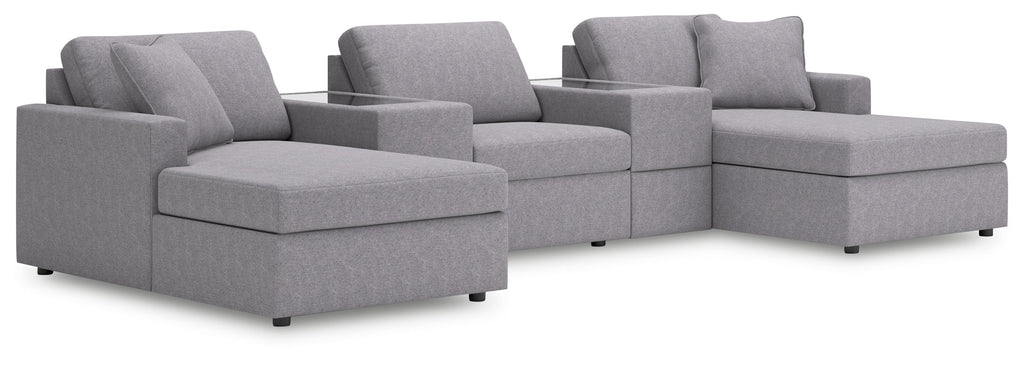 - Includes 5 modular pieces: left-arm facing corner chaise, armless chair, 2 consoles with storage and right-arm facing corner chaise