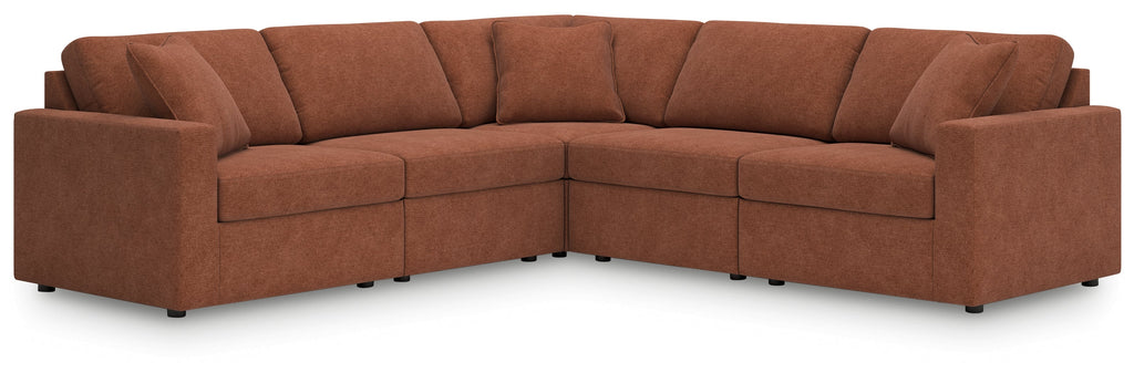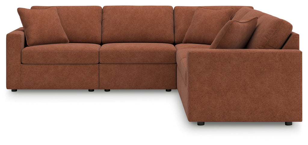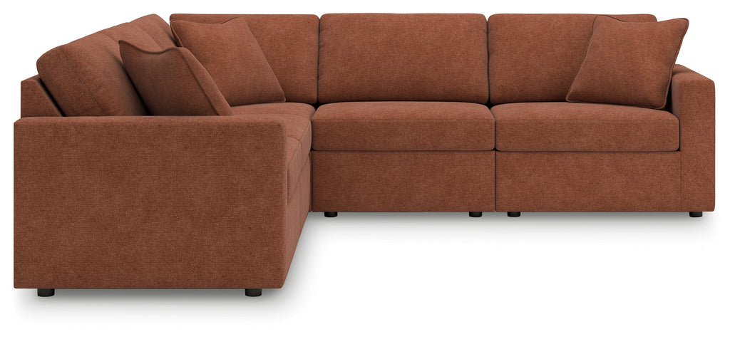 - Includes 5 modular pieces: left-arm facing corner chair, 2 armless chairs, wedge and right-arm facing corner chair