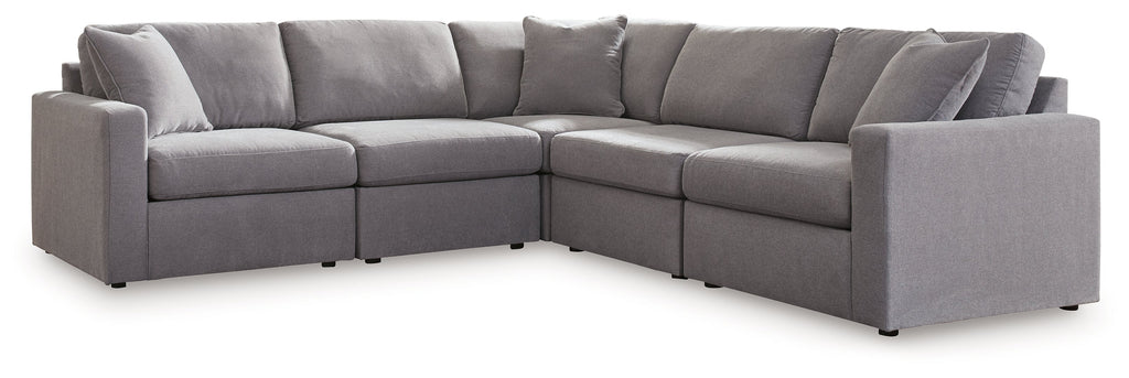 - Includes 5 modular pieces: left-arm facing corner chair, 2 armless chairs, wedge and right-arm facing corner chair