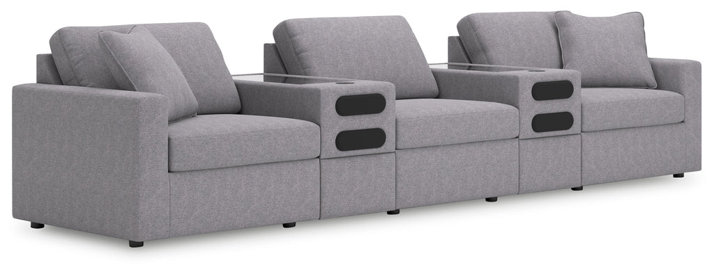 - Includes 5 modular pieces: left-arm facing corner chair, armless chair, 2 audio consoles with storage and right-arm facing corner chair