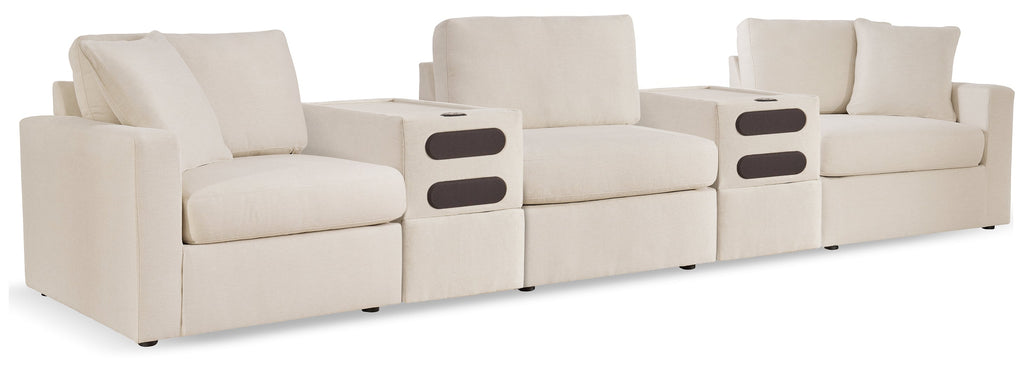 - Includes 5 modular pieces: left-arm facing corner chair, armless chair, 2 audio consoles with storage and right-arm facing corner chair