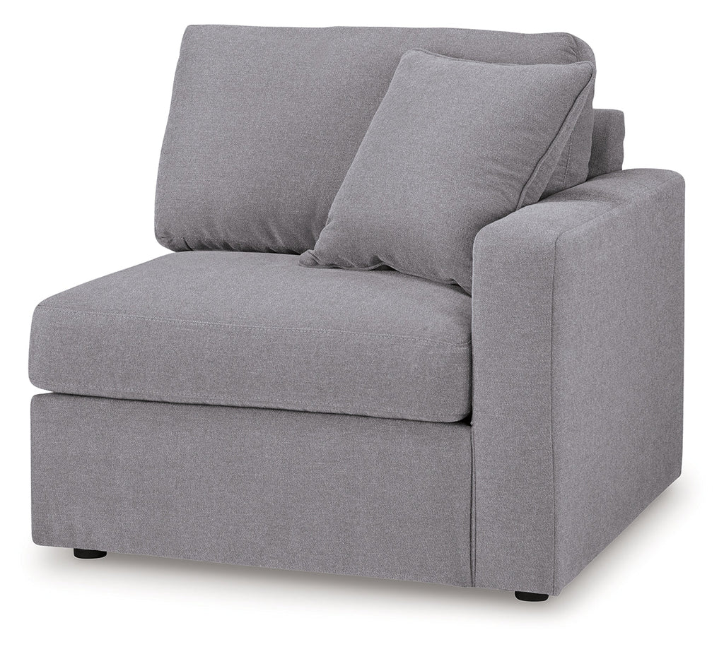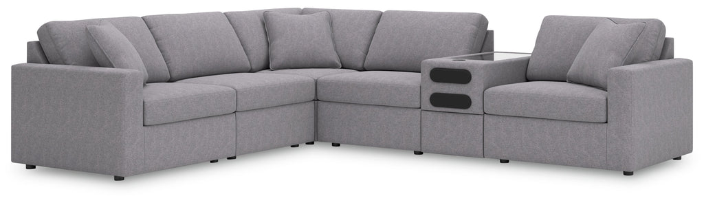 - Includes 6 modular pieces: left-arm facing corner chair, 2 armless chairs, audio console with storage, wedge and right-arm facing corner chair