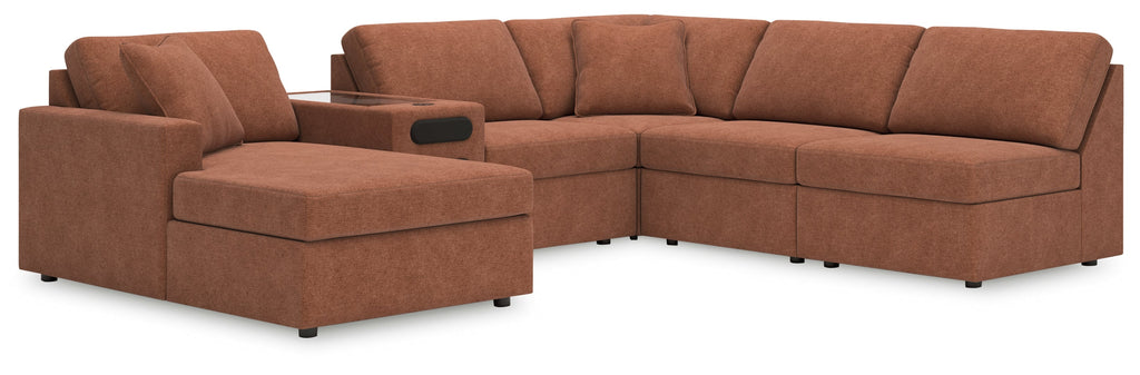 - Includes 6 modular pieces: left-arm facing corner chaise, audio console with storage, wedge and 3 armless chairs