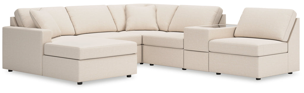 - Includes 6 modular pieces: left-arm facing corner chaise, 3 armless chairs, console with storage and wedge