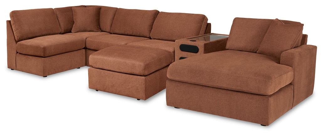 - Includes 6 modular pieces: right-arm facing corner chaise, audio console with storage, wedge and 3 armless chairs