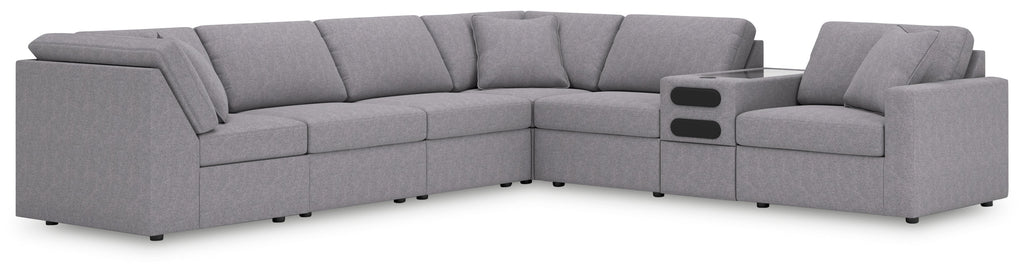 - Includes 7 modular pieces: right-arm facing corner chair, 3 armless chairs, audio console with storage and 2 wedges