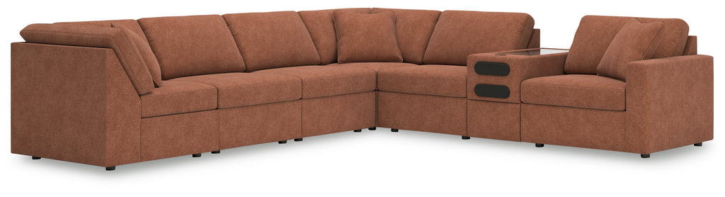 - Includes 7 modular pieces: right-arm facing corner chair, audio console with storage, 2 wedges and 3 armless chairs