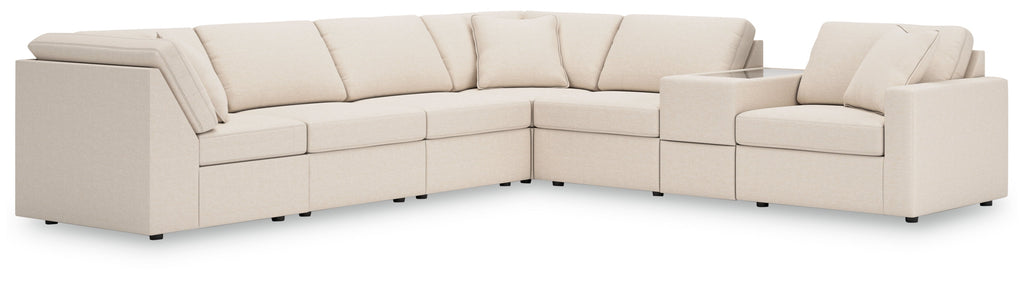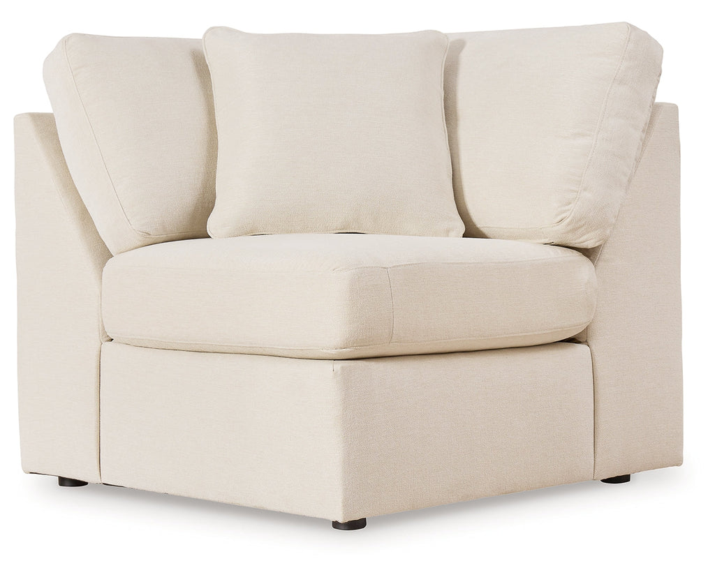 - Includes 7 modular pieces: right-arm facing corner chair, 3 armless chairs, console with storage and 2 wedges