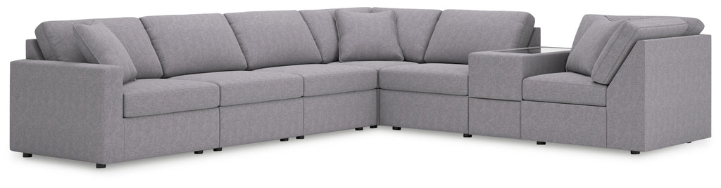 - Includes 7 modular pieces: left-arm facing corner chair, 3 armless chairs, console with storage and 2 wedges