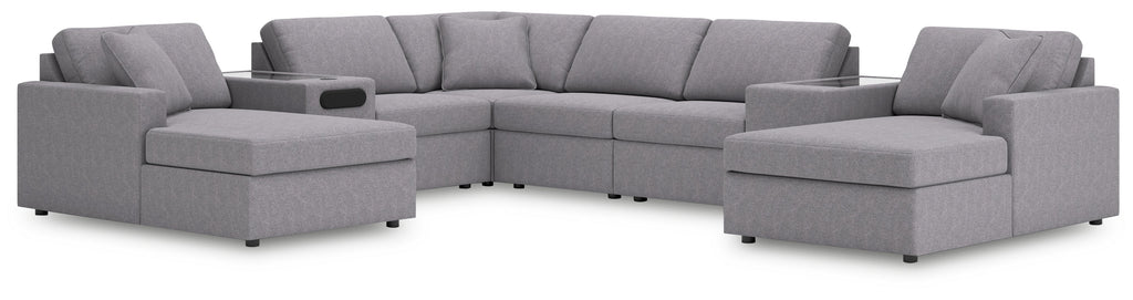- Includes 8 modular pieces: left-arm facing corner chaise, audio console with storage, console with storage, 3 armless chairs, wedge and right-arm facing corner chaise