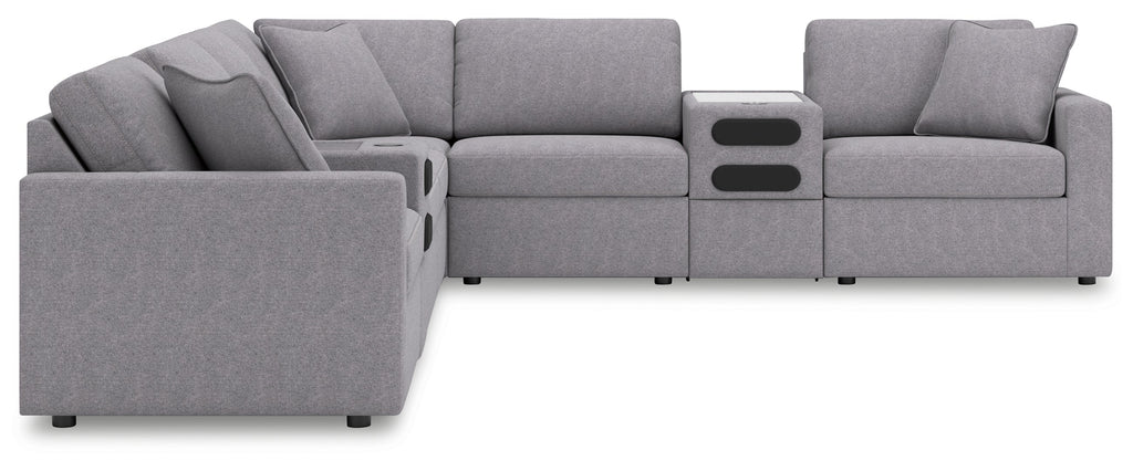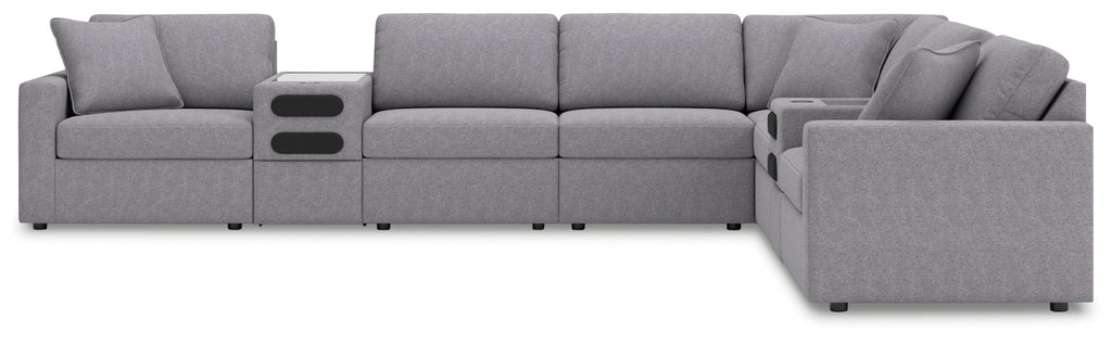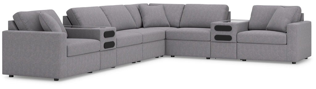 - Includes 8 modular pieces: left-arm facing corner chair, 2 audio consoles with storage, 3 armless chairs, wedge and right-arm facing corner chair