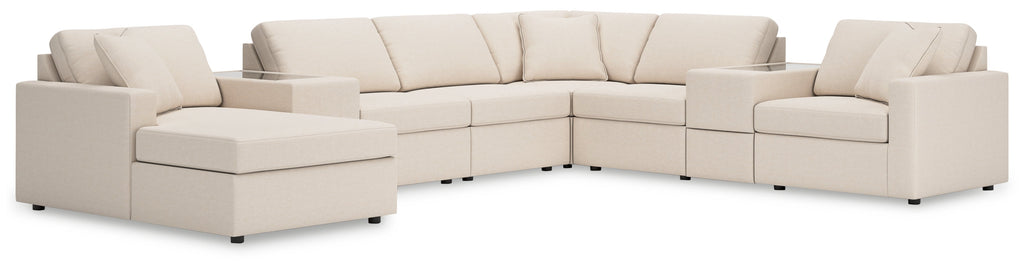 - Includes 8 modular pieces: left-arm facing corner chaise, 3 armless chairs, 2 consoles with storage, wedge and right-arm facing corner chair