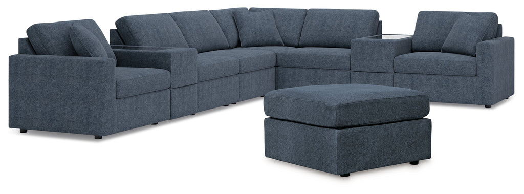- Includes 8 modular pieces: left-arm facing corner chair, 3 armless chairs, 2 consoles with storage, wedge and right-arm facing corner chair
