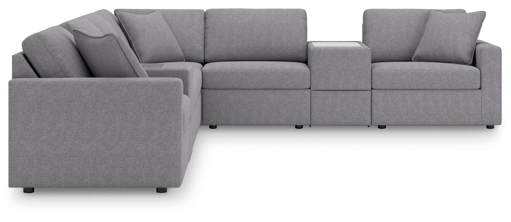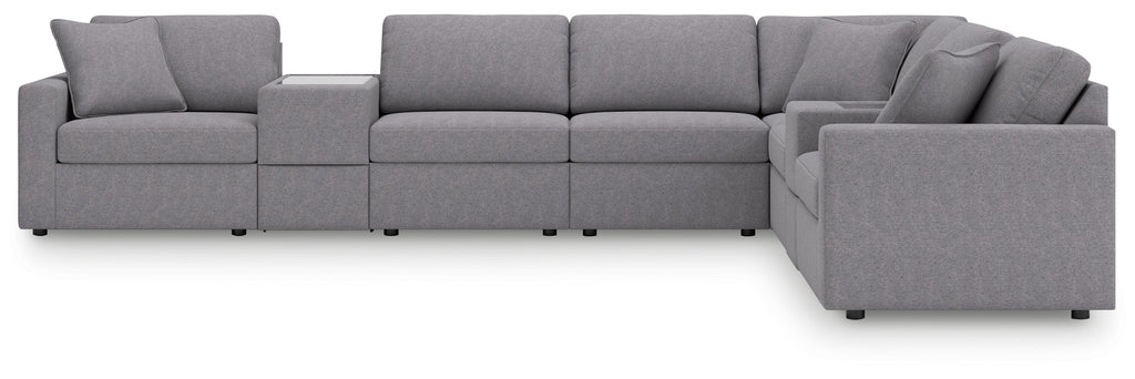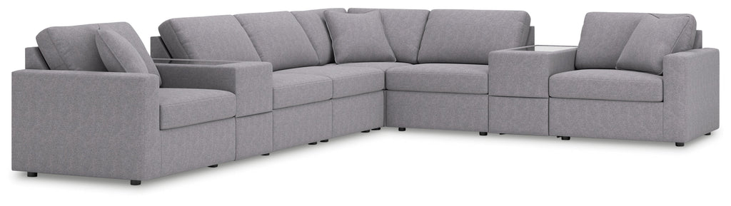 - Includes 8 modular pieces: left-arm facing corner chair, 3 armless chairs, 2 consoles with storage, wedge and right-arm facing corner chair