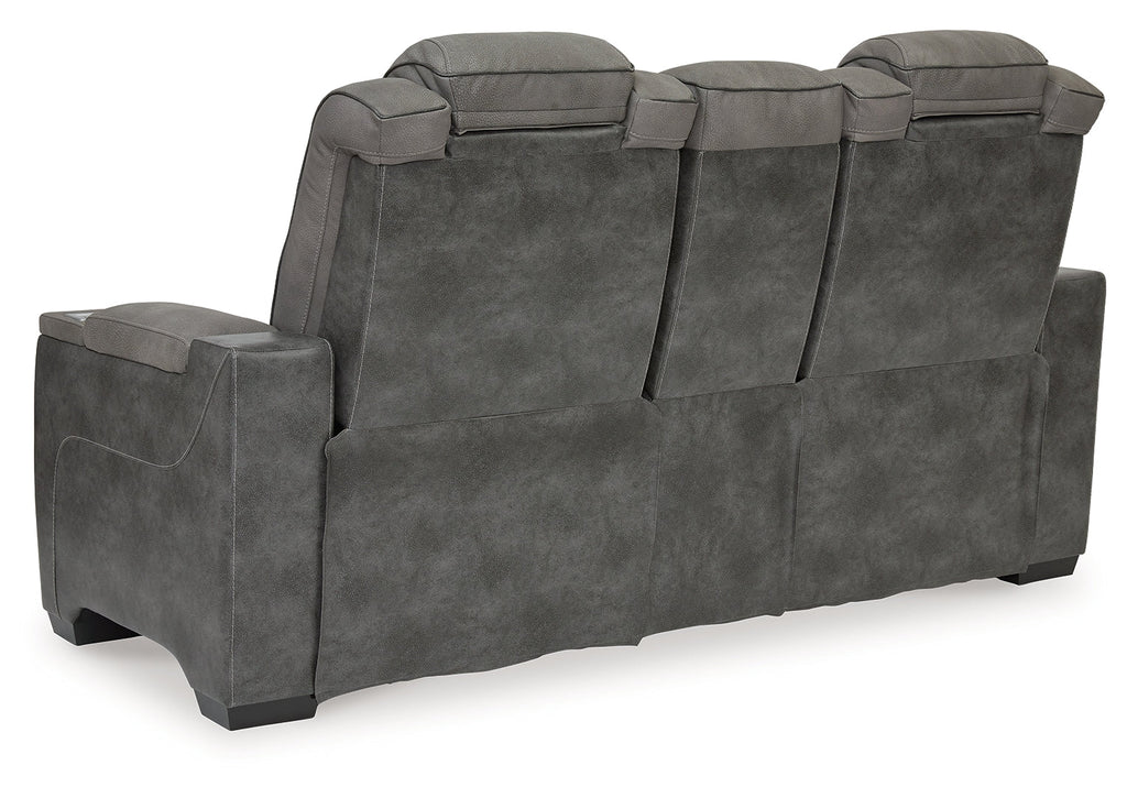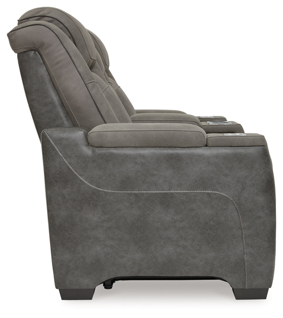 This sleek, ultra-modern power reclining loveseat has it all. With designer looks and head-to-toe comfort, it has the upscale look of leather at a scaled-down faux leather price. Its gray two-tone upholstery is more durable and water-repellent than regular leather, an added bonus for families with children or pets. Features including wireless and USB charging, an adjustable headrest and an extended "zero-gravity" ottoman for improved circulation make this the next generation of power recliners.
