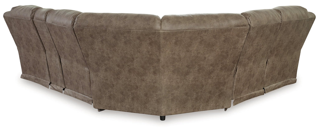 This power reclining sectional is designed exclusively for those who are serious about R&R. Its overstuffed cushions and pillow top arms feel oh-so-plush, and the faux leather upholstery accented with jumbo stitching is silky soft. Go from upright to reclined relaxation with just one touch. A clever center console provides storage and keeps drinks at the ready.