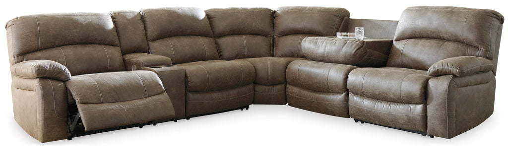Sporting a driftwood brown faux leather with a gently distressed sense of charm, this sectional invites you to drift away in high style. Rest assured, the sectional’s leather alternative upholstery offers a warm, cozy feel, while clean-lined styling and jumbo stitching deliver the cool, contemporary look you love. Factor in a power reclining motion, USB charging, convenient cup holders and a drop-down table, and you’ve got all the makings for the best seats in the house.
