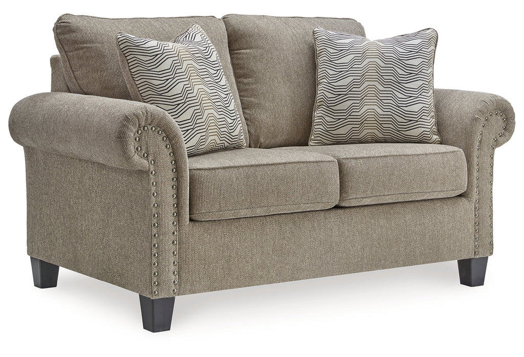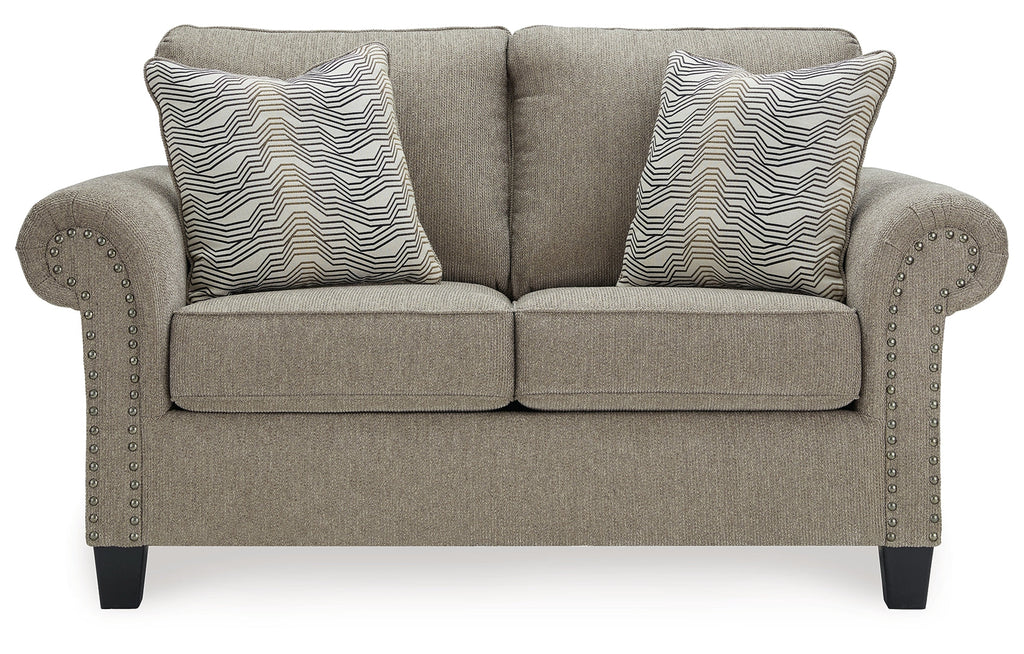 Sporting traditional elements including roll arms with nailhead trim, this loveseat gives here-and-now relevance to a classic style. The lovely pewter shade of the textured chenille upholstery brings a relaxed sensibility. Mix in contrasting tapered legs for a striking look you're sure to love for years to come.