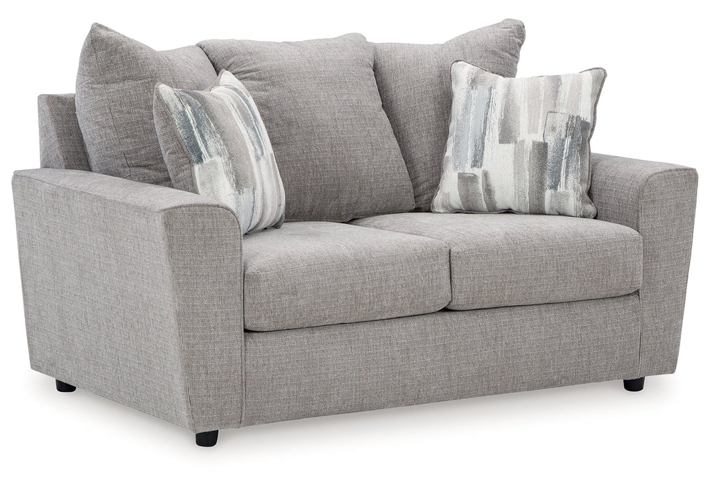 What’s new in neutrals? Shades of gray, of course. Embrace the sophisticated design trend with this gorgeous loveseat, which offers a clean-lined, contemporary style at a comfortably cool price. Sure to lift your spirits, the plush chenille fabric is fabulously neutral. Modern flared arms give it a distinctive flair. This loveseat also arrives with two cool brushstroke accent pillows to elevate the taste and comfort level.