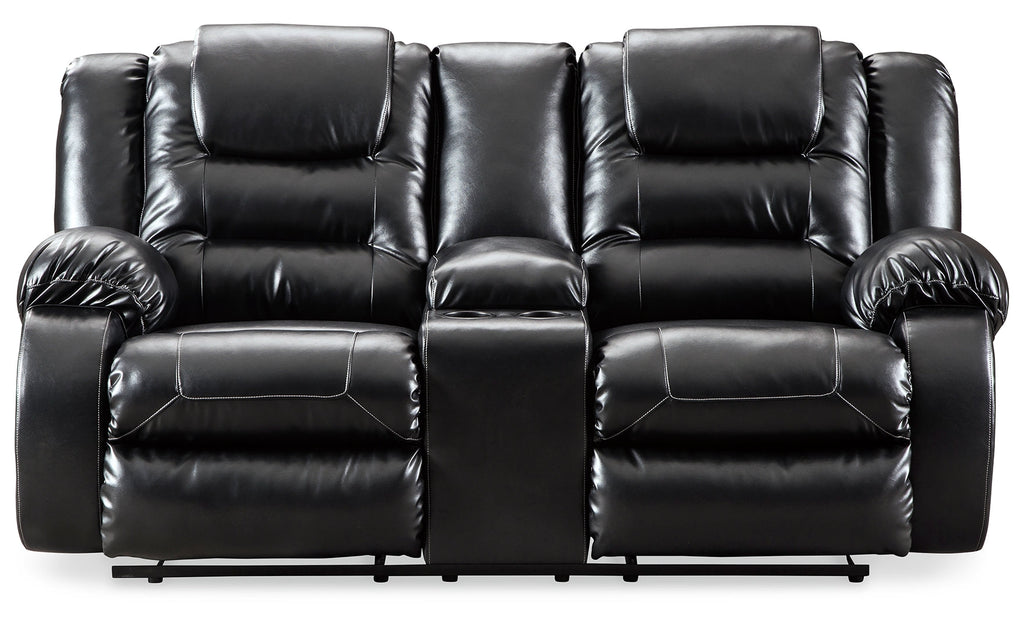 When it comes to comfort, style and value, this faux leather reclining loveseat in black rocks. Tailored for feel-good flair, its fashion-forward bustle back design is enhanced with sculpted padding on the headrest for cradling support. Channel cushioning along the sides flows into thick, wrapped pillowtop armrests that are truly over the top. And while it might look like you broke the bank, a sumptuously soft leather-like fabric keeps indulgence well within budget.