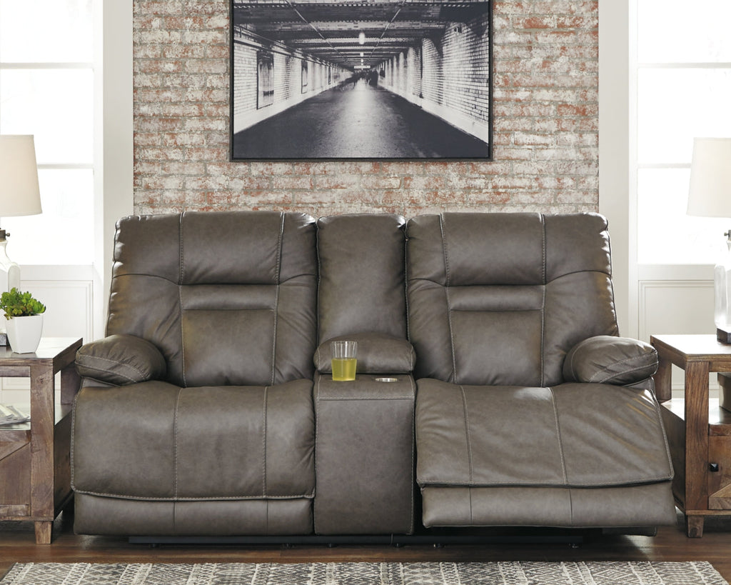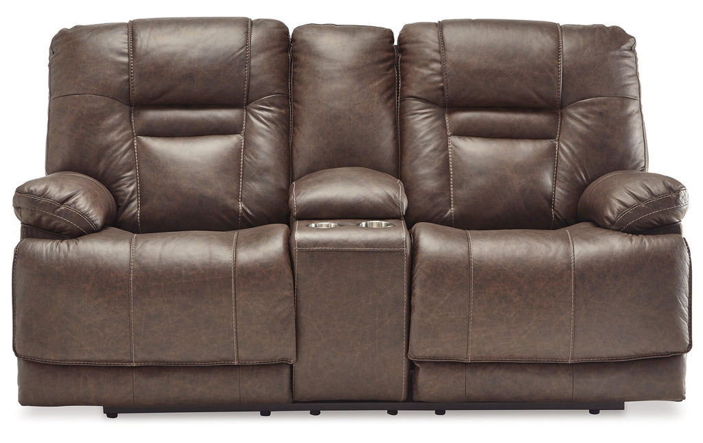 Big and bold, this power reclining loveseat with console and Easy View™ power adjustable headrests delivers comfort at the touch of a button. Easily position the recliner, its headrest and lumbar support to your liking for maximum comfort. Plus, with the convenient USB charging ports, cell phones or laptops can be charged without having to get up. Real leather is paired with expertly matched faux leather to level up affordable luxury. The detailing on the umber-colored upholstery creates a rustic look ideal for your modern or casual setting. The center console tops off convenience with hidden storage under center armrest—perfect for tucking away remotes. You'll love keeping drinks within reach with the two stainless steel cup holders.