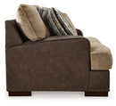Punctuated by a subtle band of nailhead trim, this loveseat is perfect for those who love the look of leather. Two textural tones provide twice the style and comfort—and incorporate an added layer of visual interest. Throw pillows add a fun decorative element.