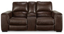 Impressive in scale while keeping an air of refinement, this power reclining loveseat stuns with a combination of soft, supple leather and perfectly matched faux leather upholstery in garnet. Sink into the seating area and cater to your comfort with one-touch power reclining and an adjustable headrest. Complete with USB charging, this loveseat makes a surefire statement in your contemporary living room.