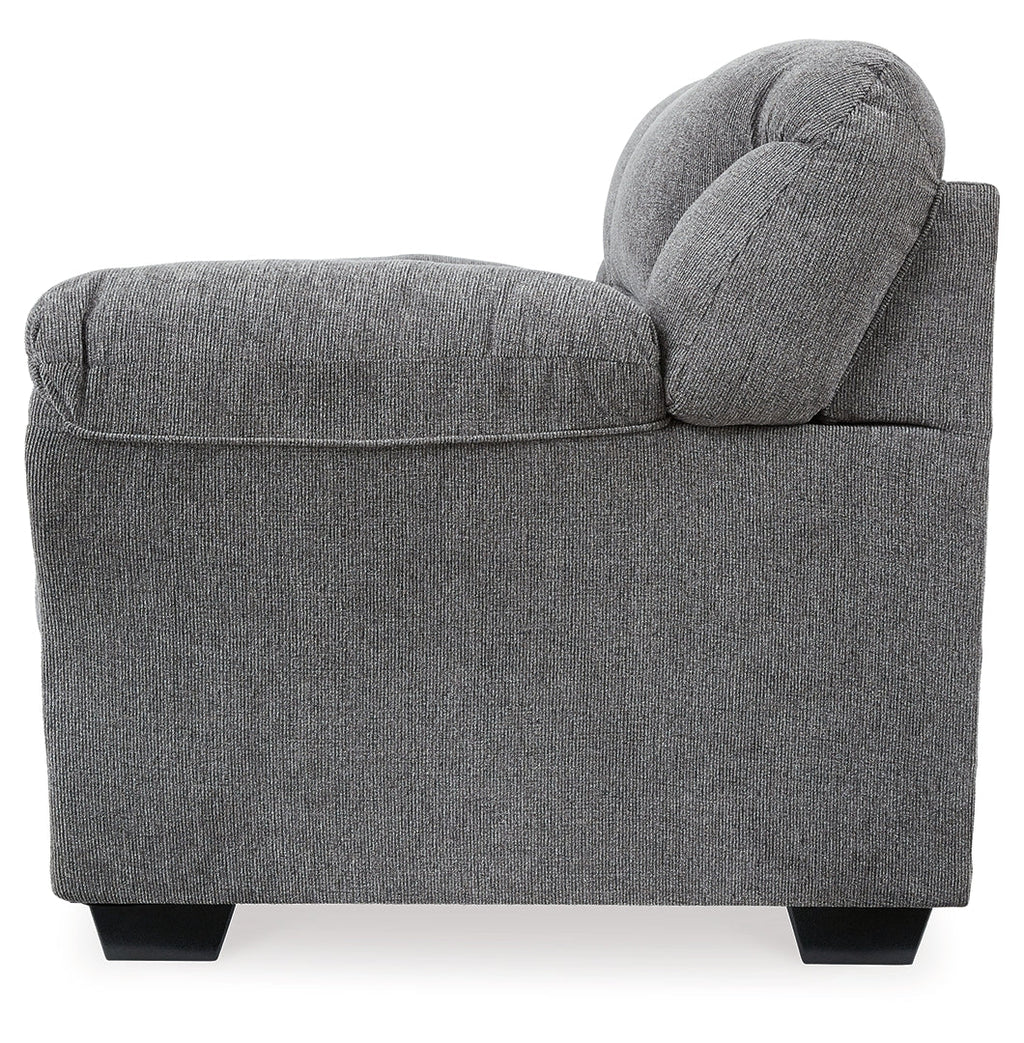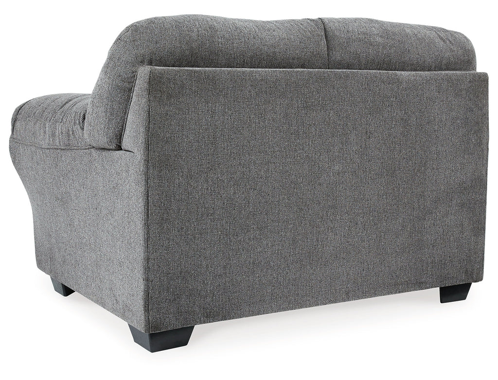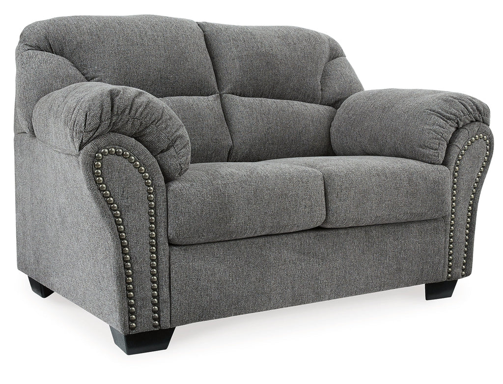 Why sacrifice comfort for style (or style for comfort) when you can have the best of both in this loveseat in pewter gray. Elements include a chic divided-back design and pillow top wrapped armrests that make nodding off all too easy. Calling attention to the elegantly flared armrests—black nickel-tone nailhead trim for a punch of cool character.