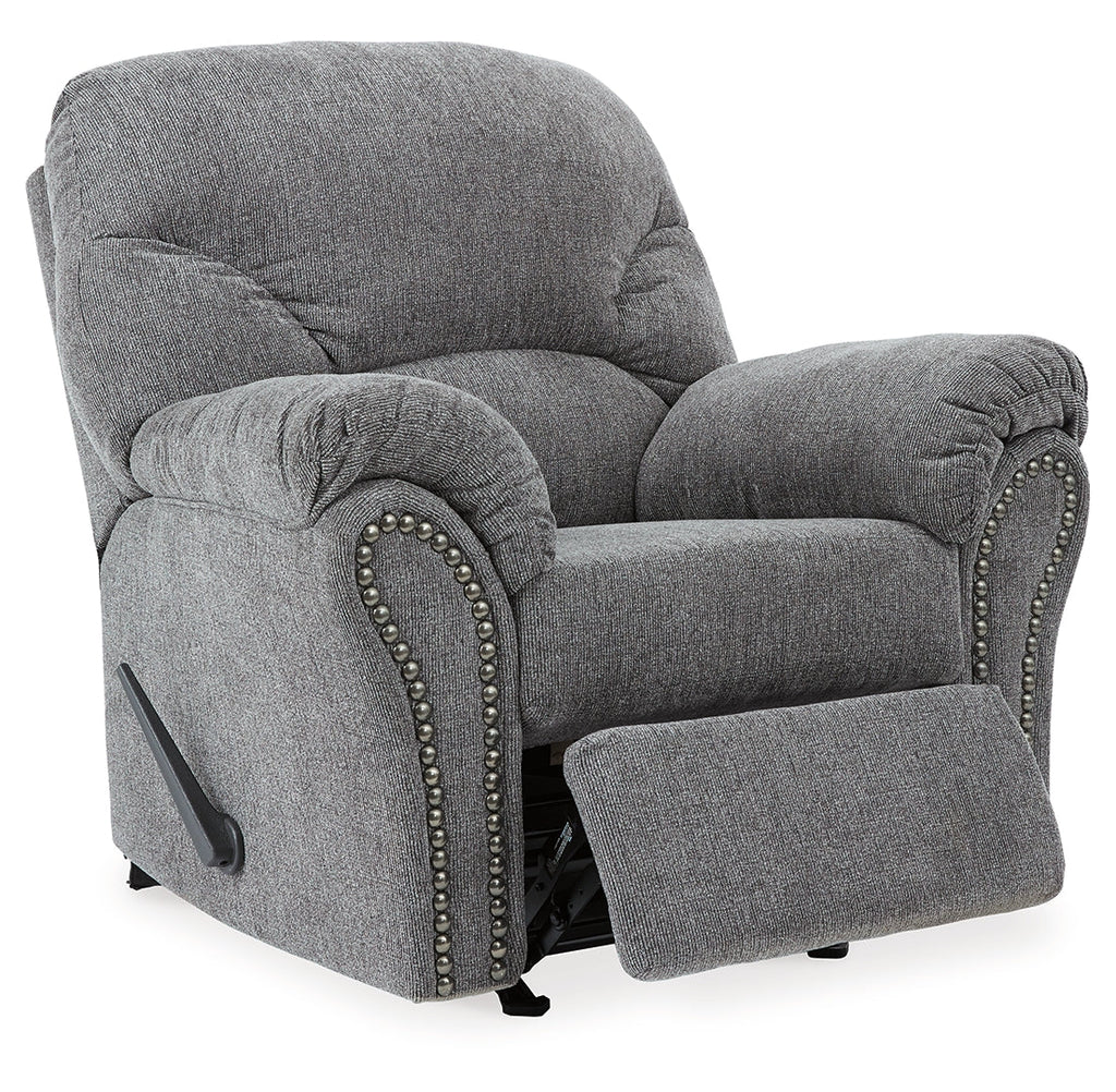 Why sacrifice comfort for style (or style for comfort) when you can have the best of both in this rocker recliner in pewter gray. Elements include a chic divided-back design and pillow top wrapped armrests that make nodding off all too easy. Calling attention to the elegantly flared armrests—black nickel nailhead trim for a punch of cool character.