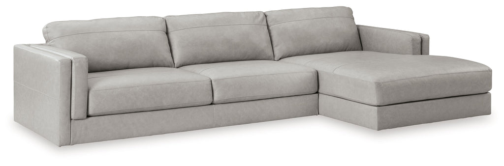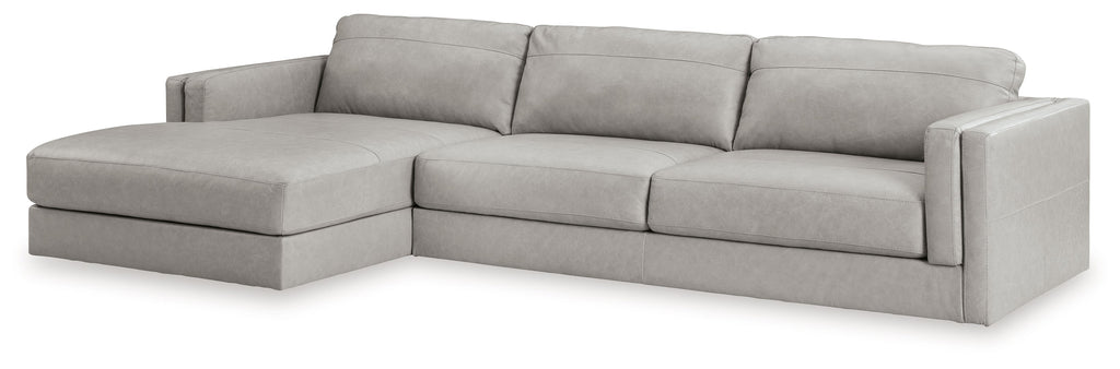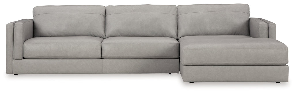 Keen on crisp, contemporary design? Adore the pleasure of leather? Look no further. This sectional with chaise satisfies on every level. Richly textured and decadently supple, the plush cushions are wrapped with leather match upholstery in an on-trend neutral tone. Sleek double-padded arms and a low, clean-lined profile complete this spacious sectional's simply chic appeal.