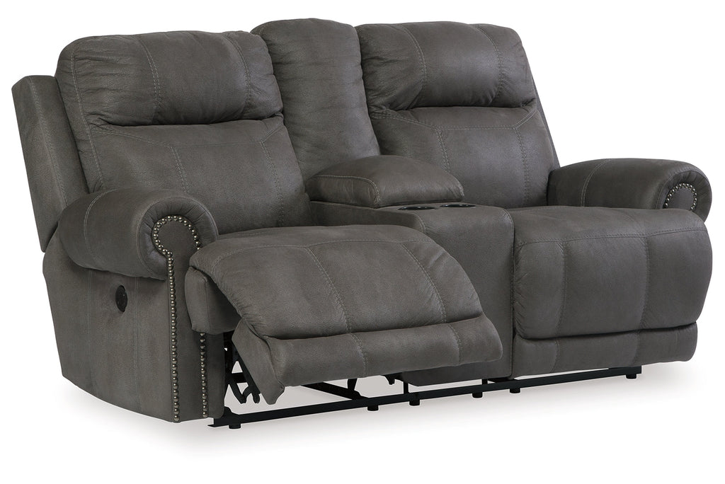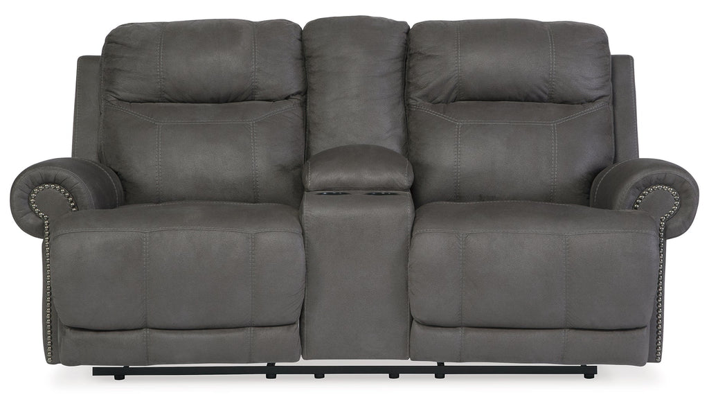Sparing that "puffy" look you might expect from a recliner, this reclining loveseat with console doesn't hold back when it comes to contemporary style. Subtle touches such as sporty jumbo stitching, nailhead trim and a "weather worn" effect on the upholstery give this handsome piece a buttoned-up appeal and fresh feel. Center console with dual cup holders brings a handy element to this handsome piece.
