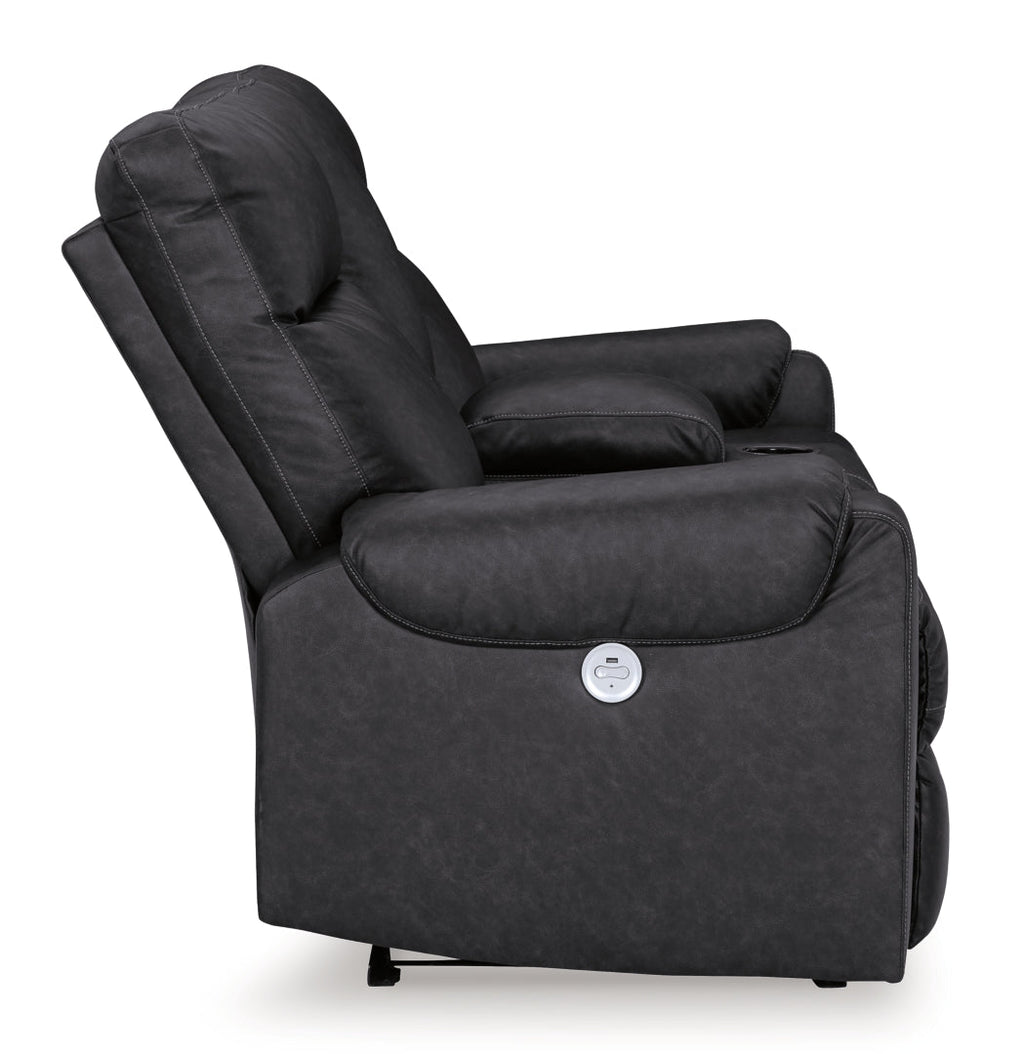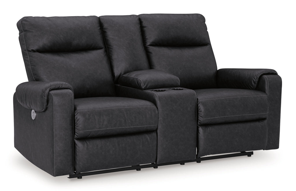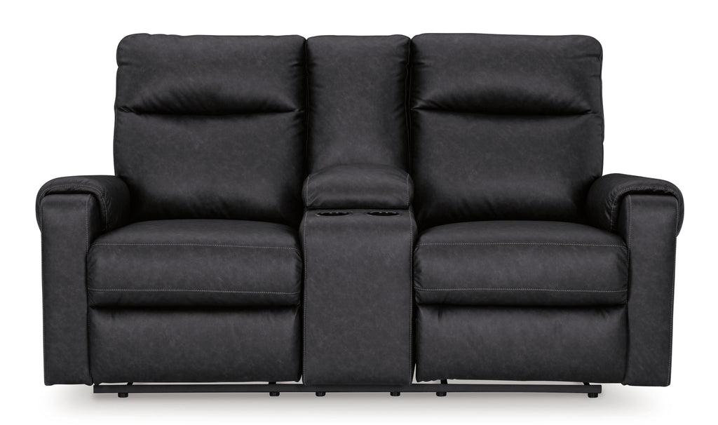 You don’t just want to recline. You want to recline in high design. This power reclining loveseat’s clean lines and supple faux leather are out to capture your heart with style and comfort. Easily tuck away remotes or gaming controllers and keep drinks close by with its handy console. This loveseat gives you the upscale look you want for less—simply take a seat, raise your legs and relax.