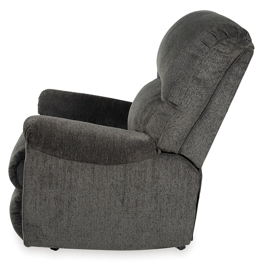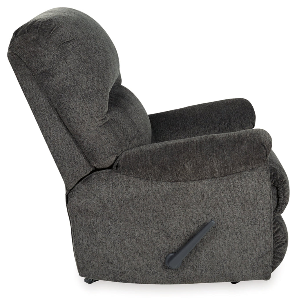 A mastery in "less is more," this rocker recliner manages to make cool, contemporary design so warm and cozy. Its smoky gray upholstery, incredibly plush to the touch, is a new twist on neutral. A curved divided back and a deeply tufted footrest give the clean-lined profile a sense of sumptuousness that's impossible to resist.