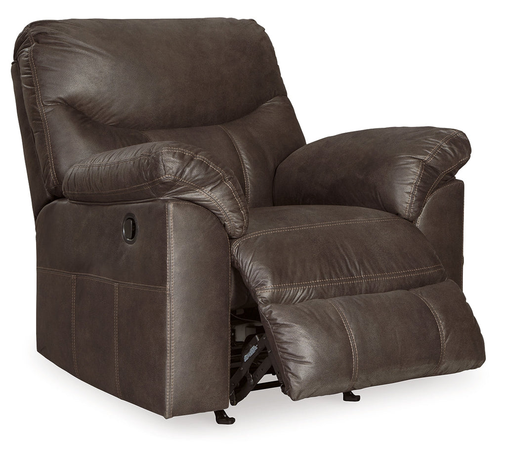 Rock the cool look of leather minus the hefty price tag with this rocker recliner. Rich with tonal variation, the indulgently soft upholstery sure looks like the real thing. And talk about indulgent comfort. Double stuffed armrests and sumptuous cushions cradle and support in all the right places. The recliner’s distinctive scooped stitching adds contemporary flair.