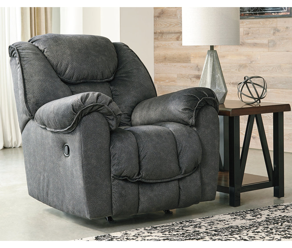 Sometimes seeing is believing. Rest assured this rocker recliner is every bit as indulgent as it looks. Designed to put you in the lap of luxury, this generously scaled recliner—wrapped in a wonderfully plush and practical granite gray upholstery—sports scooped pillow wrapped armrests and curvaceously cushioned head-neck support for feel-good flair.