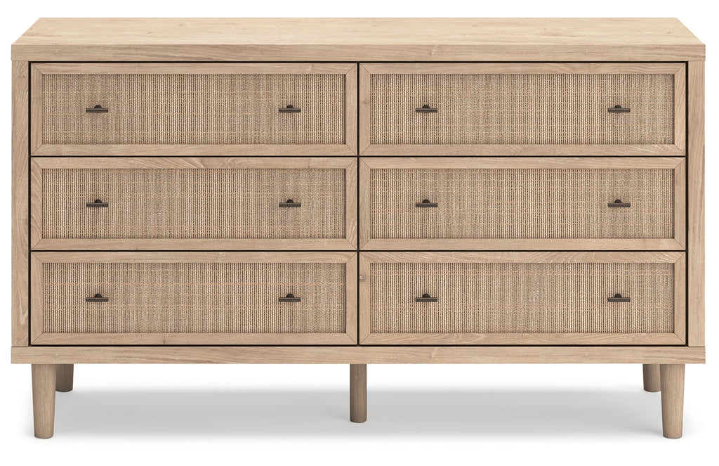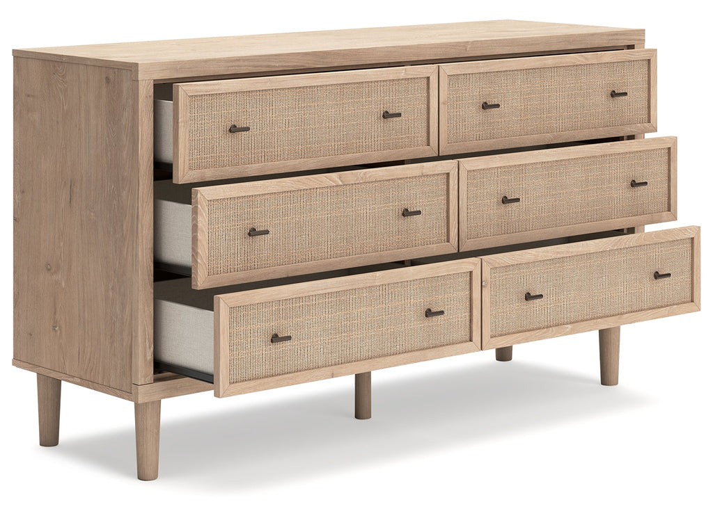 Clean-lined and contemporary—but far from stark—this dresser is a fresh style awakening. Pairing a light finish with replicated oak grain and textured beige cane details, its mixed materials bring a naturally versatile vibe to your bedroom. Sleek, simple hardware plays perfectly with the modern aesthetic. Prepare to have your mind blown by the vast universe of possibilities that await within the spacious drawers.