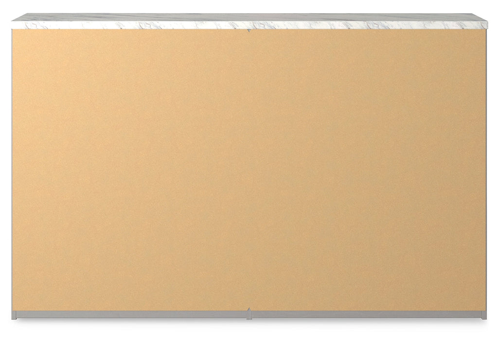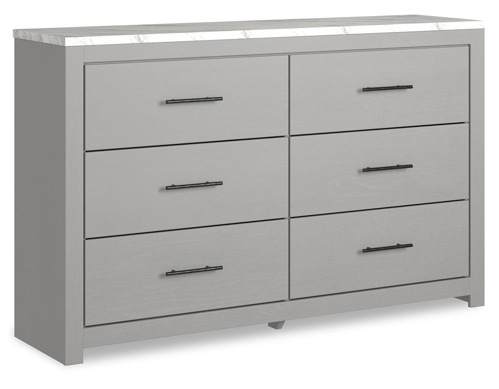 Cool, clean and casually modern. This dresser’s wispy dove gray finish and faux Calcutta marble top set the tone for your calming sanctuary. Large linear pulls add dimension and authenticity. Six smooth-gliding drawers neatly accommodate your wardrobe needs.