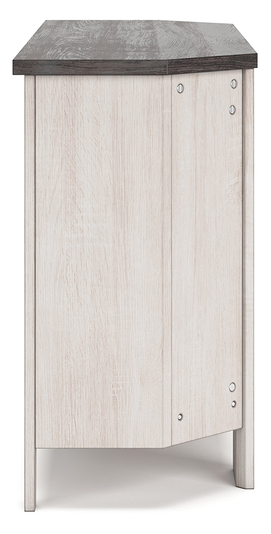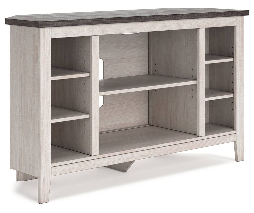 With its minimalist charm, this TV stand is right in tune with your relaxed approach to high style. Beautifully shaped to nestle into any corner, it’s well equipped with a flexible open-concept design and cutouts for wire management that enhance the clean-lined aesthetic. The look is ideal for modern farmhouse and contemporary settings.