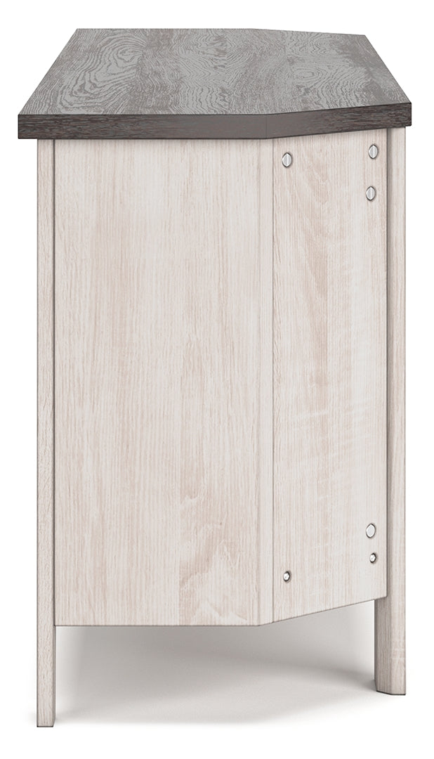 With its minimalist charm, this TV stand is right in tune with your relaxed approach to high style. Beautifully shaped to nestle into any corner, it’s well equipped with a flexible open-concept design and cutouts for wire management that enhance the clean-lined aesthetic. The look is ideal for modern farmhouse and contemporary settings.