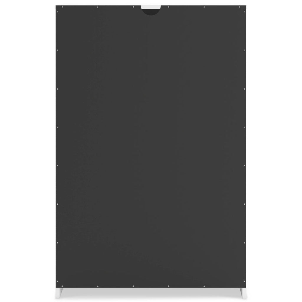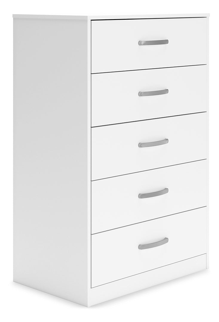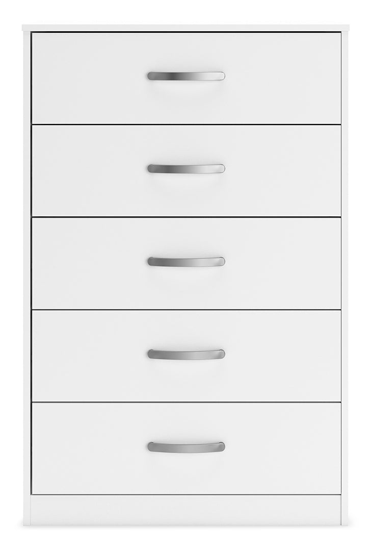 This chest of drawers has simple lines and contemporary styling, allowing it to blend seamlessly with any decor. Five spacious drawers slide easily on metal ball bearings and can be used to keep your clothes neat and organized. Sleek metal pulls in a brushed nickel-tone finish add to the streamlined aesthetic. Combine with other units in the collection to create a room that’s smart and stylish.